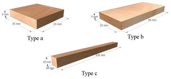 European beech (Fagus sylvatica L.) heart-wood specimens of high quality, i.e., without rot, insect gallery, growth defects, tension wood or red-false wood were prepared from the sawn timber naturally seasoned to a moisture content of 13.5% ± 2%. Three types of specimens were used in the experiment—type (a): 25 mm × 25 mm × 5 mm in mycological tests and in testing the Brinell hardness; type (b): 5 mm × 50 mm × 25 mm in testing the soaking and swelling, and type (c): 120 mm × 10 mm × 10 mm in testing the impact bending strength (Figure 1). The top and bottom surfaces of specimens of the type (a) and type (b) were milled.