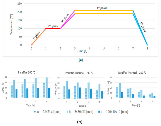 The weight percent gain (WPG, and also WPG*) values of paraffin into beech wood specimens were affected by their dimension, at which the lowest WPG (or WPG*) values had specimens of Type (c) 120 mm × 10 mm × 10 mm (L × T × R) with the smallest portion of axial surfaces (Figure 2b). The so-called WPG* (WPG − ΔmThermal) values were simultaneously affected by weight losses of specimens caused by degradation of hemicelluloses and other components of wood at the high temperatures of 190 or 210 °C acting from 1 to 4 h (Figure 2b).