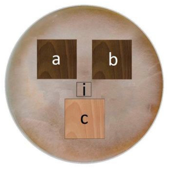 Petri dish with three beech wood specimens (a, b—modified by the same mode, c—reference) and fungal inoculum (i).