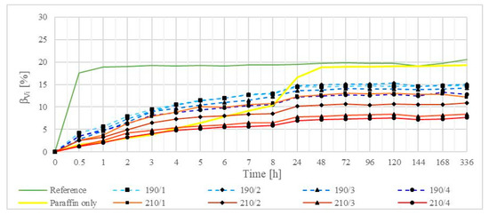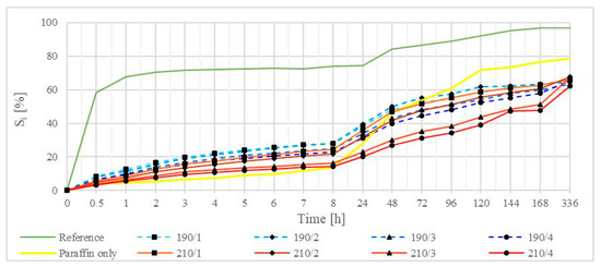 In accordance with several research studies [44,45,46] the fact that swelling of wood was reduced especially due to its thermal modification while the role of paraffin was only to slow down kinetics of swelling was confirmed (Table 3, Figure 5). Thermal modification of wood results in changes in its molecular structure, i.e., the polysaccharides (especially hemicelluloses) depolymerized, the microcrystalline cellulose portion increased, the lignin linkage occurred and therefore, the presence of free hydroxyl groups in wood decreased [47].
