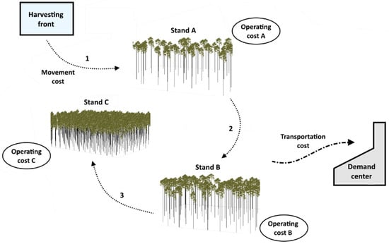 We build here a novel optimization model for the daily schedule of forest harvesting fronts across forest stands, in order to meet the daily demand for different products (timber assortments) at the demand centers, taking into account transportation costs (see Figure 1). The harvesting equipment, in combination with the skidding equipment, typically composes a harvesting front (e.g., harvester + forwarder + loader or feller buncher + skidder + processor + loader combinations). We aimed to minimize the total cost of harvesting operations, including the harvesting operating cost, depending on the stands’ topographic and structural characteristics, the movement cost, i.e., the cost related to moving the machinery between forest stands and the cost related to the transportation of wood from stands to the demand centers. Thereby, we could find an optimal machinery schedule, in terms of where to allocate each harvesting front in each day of the planning horizon, in order to increase the economic efficiency of forest harvesting and transportation.