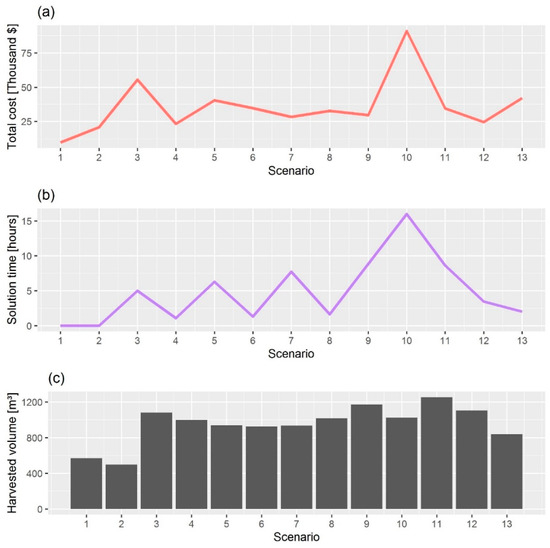 Optimization results for the 13 scenarios tested, in terms of the objective function value (a), solution time (b), and harvested volume (c).