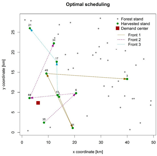 The contribution of the different cost factors to the total cost of harvesting operations for selected scenarios is shown in Table 2. We noted that the transportation cost of forest products from the stands to the demand center was the dominant component of the total harvesting cost, amounting to more than 75% of the total ($30,320.5 and $16,304.8). The operating cost represented 13% of the total cost for scenario 5 and 10% for scenario 2, with a slighter higher contribution than the movement cost, which amounted to 12% and 11% of the total, respectively. Figure 3 illustrates the respective optimal solution for the same scenario, composed by 50 stands and a planning horizon of 15 days. Within this time span, each front completely harvested three stands, with differing operating times. The fronts were scheduled so that the three harvesting fronts were not moved between stands in a same day of the planning horizon, allowing a continuous supply of wood in the demand center. Additionally, the harvesting was prioritized in stands closer to the demand center (see Figure 4), thus reducing the transportation costs related to the demand for different assortments and the total cost of harvesting operations (since this was the dominant cost component). Nevertheless, in the optimal scheduling in scenario 5, we found the displacement of harvesting front 1 to stand 3, at the end of the planning horizon, despite the long movement and transportation distances. This pattern was a result of the combination of favorable topographic conditions and the stock availability in this stand to meet the daily demand for the largest wood assortment.