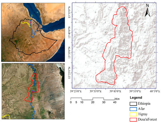 Desa’a forest is located 60 km northeast of Mekelle, the capital city of the Tigray region, Ethiopia. The total forest area is estimated to be 120,026 ha [30]. The forest is located in two administrative regions, namely Tigray and Afar, with the majority of the forest residing in the Tigray region (Figure 1). Geographically, the forest is situated between 13°18′ and 13°58′ North latitude and 39°35′ and 39°54′ East longitude. The altitude of the area ranges from 900 to 3000 m a.s.l. The area has a unimodal rainfall pattern, with the peak rainy season being from July to August [16]. Based on 10 years (2007–2016) of data from a nearby weather station, the area receives a mean annual rainfall of 532 mm, and the average temperature is 18 °C [29]. Desa’a forest is dominated by Juniperus procera Hochst. ex Endl. and Olea europaea L. subsp. Cuspidata (Wall. ex DC.) Ciffieri, which are characteristic species of Afromontane forests.