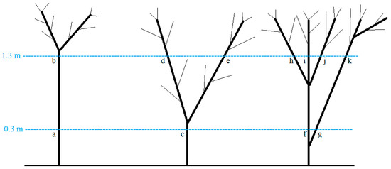 Illustration on how diameter at breast height (DBH) and diameter at stump height (DSH) were measured in different situations. For trees forking above 1.3 m, DSH was measured at 0.3 m (a) and DBH at 1.3 m (b). For trees forking below 1.3 m but above 0.3 m, DSH was measured at 0.3 m (c) and DBH was at 1.3 m (d,e). For trees forking below 0.3 m, DSH was measured at 0.3 m (f,g) and their DBH at 1.3 m (h–k).
