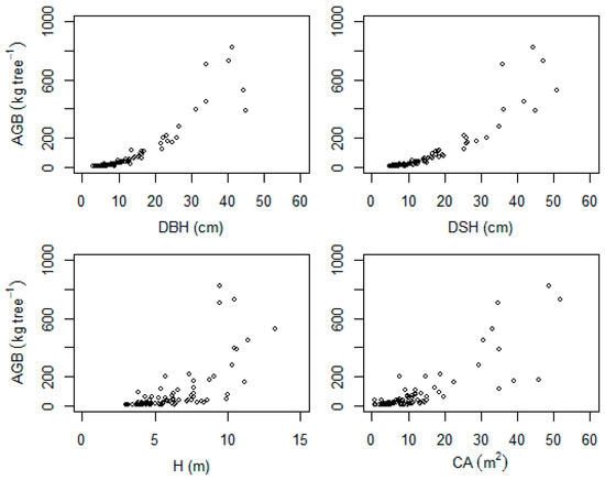 All statistical analysis were done using R software [35]. Before establishing the allometric models, we used a correlation matrix plot to explore the relationships between the response variable (AGB) and the potential predictor variables (DBH, DSH, H, CA, ρ). Aboveground biomass was significantly correlated with DBH (r = 0.91), DSH (r = 0.90), CA (r = 0.81), and H (r = 0.69) but was not significantly correlated with ρ (r = 0.14). Although ρ was not significantly correlated with AGB, we included it in our model testing because it varies considerably between different species [34] and is, therefore, considered as an important variable to explain variations in biomass for multispecies AGB models (e.g., [11,36]).