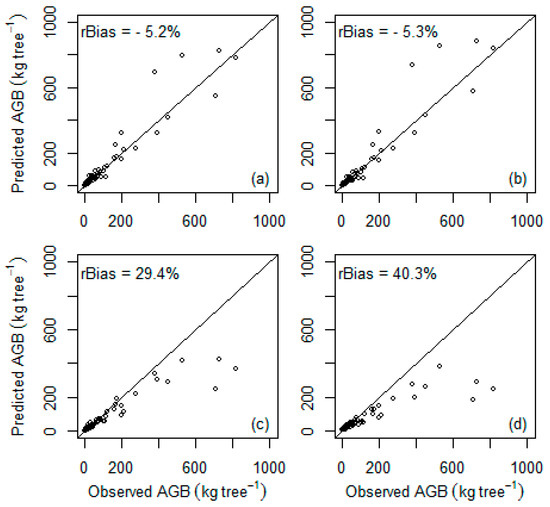 Relationship between predicted and observed AGB of sample trees of all species pooled together (n = 86). (a) Chave et al. [10], (b) Chave et al. [11], (c) Ubuy et al. [19], (d) Mokria et al. [2]. The diagonal line shows a 1:1 relation. A positive and negative rBias indicates under- and over-prediction of AGB, respectively.