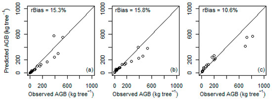 Relationship between predicted and observed AGB of Juniperus procera sample trees (n = 23) and Olea europaea sample trees (n = 16). (a) Worku and Soromessa [24] for Juniperus procera, (b) Solomon et al. [26] for Juniperus procera, and (c) Kebede and Soromessa [25] for Olea europaea. The diagonal line shows a 1:1 relation. A positive and negative rBias indicates under-and over-prediction of AGB, respectively.