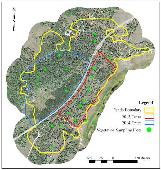 Map depicting the study area within the Pando aspen clone, Utah, USA. Twenty sample plots were randomly distributed across the study area in the following proportions: No Fence (7), 2013 Fence (7), and 2014 Fence (6), representing discrete management regimes. Base image courtesy of Google Earth® (v. 7.3, Mountain View, CA, USA)