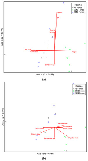 Ordination analysis resulted in a two-dimensional solution on a matrix of 20 plots by 18 variables. We projected the results of the NMS in ordination “plot-data space” as a joint plot highlighting environmental variables as overlay vectors (Figure 2a). The final NMS solution produced a stress value of 8.84 with an instability of 0.00. A Monte Carlo test of 250 random data runs versus the real data set verified a significant NMS outcome (p = 0.03). A two-axis solution described about 87% of ordination variance (axis 1: r2 = 0.489; axis 2: r2 = 0.377; and orthogonality = 99.8). Length and direction of vectors corresponds to environmental variable strength and relationship to the two-dimensional plot-data space. Only environmental variables making the strongest contributions to data ordinations are shown (i.e., r2 ≥ 0.3) in the joint plot (Figure 2a). Table 3 presents NMS results by axes for all environmental variables. Most measures tested in this ordination contributed very little to environmental gradients (NMS axes) at Pando. Strong positive and negative responses to axis 1 (Figure 2a) represent factors working in opposition in terms of their influence on the totality of plot variable values at Pando. Axis 1 describes a gradient of regeneration abundance with a negative correlation to deer and cattle presence. This result is nearly identical to that reported previously [31]. Axis 2 illustrates an inverse correlation between aspen cover (collectively) and understorey species diversity. A moderately strong correlation of aspen recruitment to axis 2 may present a spurious result given the low overall recruitment occurrence among our sample sites (with the exception of a single anomalous plot in a 1992 historic clearfell-coppice cut area [30]). Figure 2b projects species vectors as an overlay on the main ordination to gauge how particular plants align with explanatory variables. Only those species with r2 > 0.3 are shown. While most plants showed no particular statistical relation to prime NMS axes, P. tremuloides, Cirsium clavatum, Festuca thurberi, and Penstemon watsonii displayed robust correlations (r > 0.5 or < −0.5) to these environmental gradients (Table 4).