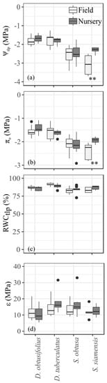 To investigate whether the leaf water relations quantified in the nursery seedlings were comparable to seedlings grown under field conditions, we also measured pV curves for eight D. obtusifolius, nine D. tuberculatus, six S. obtusa, and five S. siamensis seedlings that had been outplanted into the field as part of a separate experiment. All nursery and outplanted seedlings were grown from the same seed collections (i.e., same source and age) and measured for pV curves in the same period with the same pressure chamber. The outplanted seedlings had grown for two months in the nursery (after germination) and were then outplanted in the DDF 16 months prior to measurement. Most of the outplanted seedlings also lost their above-ground stems in the first dry season under natural conditions. However, they all resprouted in the following wet season, resulting in multiple stems field seedlings. Neither fertilizers nor supplementary water was applied to the field-grown seedlings.