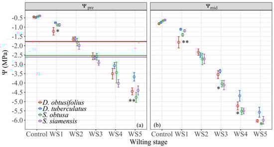 Means of Ψpre (a) and Ψmid (b) of the four dipterocarp species at five wilting stages. Horizontal lines indicate Ψtlp for each species. Asterisks (* and **) indicate significant difference among species in Ψpre or Ψmid within the same wilting stage at the 0.05 and 0.01 probability levels, respectively.