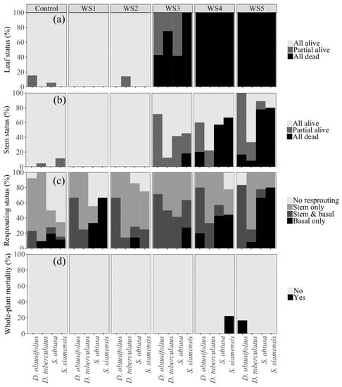 The water level experienced at wilting stages (WS) 1 and 2 generally did not affect the leaves and stems of the seedlings (Figure 3a). However, at WS 3, water deficit was severe enough to lead to the partial or complete loss of leaves and, in some cases, all stems of the seedlings (Figure 3a). At WS 4 and 5, water deficit led to the loss of all leaves in all species and, in many cases, to the loss of all stems (Figure 3a,b). Shorea species were likely to lose all of their stems, whereas Dipterocarpus species typically did not (Figure 3b).