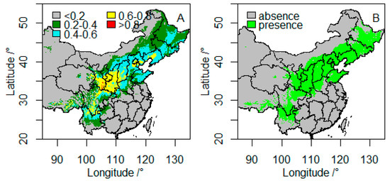 Distribution maps of current suitable habitat of P. davidiana in China: (A) Probability map; (B) binary map (threshold = 0.32 in MaxEnt).