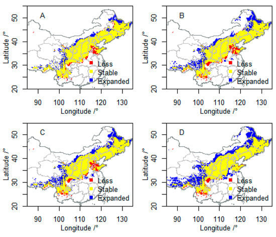 Range shifts of P. davidiana by 2070 under future climatic change scenarios: (A) Representative concentration pathway (RCP)2.6; (B) RCP4.5; (C) RCP6.0; (D) RCP8.5.
