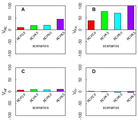 For range change, we noticed that the area of suitable habitat will increase under the studied climate change scenarios (Figure 2). The scores of VRC are 9.37, 18.31, 19.93, and 44.56 under RCP2.6, RCP4.5, RCP6.0, and RCP8.5, respectively (Figure 3A), which indicates that the range shift of suitable habitat induced by future climate change will have a positive effect on the population of the species.