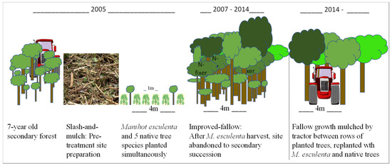 Figure 1b) was selected and mulched. Experimental treatments were applied in June 2005, and the aforementioned species were planted in four experimental blocks (N = 4). Each block was divided into four plots (n = 16) that measured 24 × 24 m. Trees and manioc were planted simultaneously, with trees planted at 4 × 1.8 m spacing, for a total of 78 trees per plot, or 1354 trees ha
