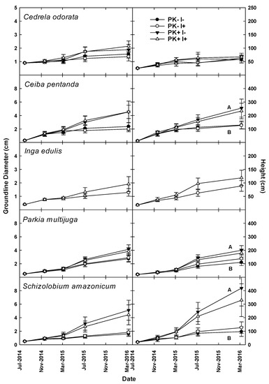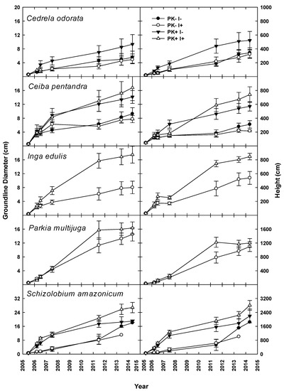 All statistical analyses were performed using SAS University Edition (SAS, Cary, NC, USA). Data distributions were evaluated prior to analysis and transformed as needed. Analyses were performed using Proc MIXED. In the factorial model, the main-plot treatment was with or without P+K fertilization, and the sub-plot treatment was with or without the N-fixing tree species I. edulis. Fert and Nfix were treated as fixed effects, and block as a random effect. Repeated measures analysis was used to account for covariance among dates, with plot as the subject. Contrast statements were used to test differences in growth rates between specific years.