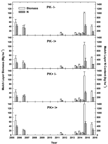 22]. In year 6, mulch mass and N content showed no treatment effects. Mineral soil N at that time was not clearly elevated by the presence of