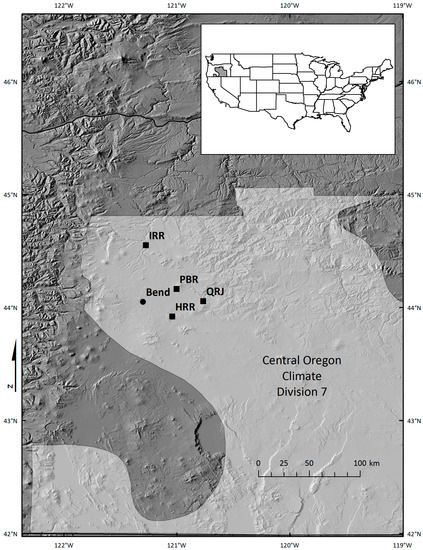 - Miller, R.F.; Rose, J.A. Historic expansion of Juniperus occidentalis (western juniper) in southeastern Oregon. Great Basin Nat. 1995, 55, 37–45. [Google Scholar]
