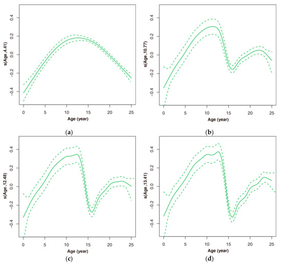 - Lin, X.; Zhang, D.; Fryzlewicz, P.; Keilegom, I.V. Inference in generalized additive mixed modelsby using smoothing splines. J. R. Stat. Soc. 2010, 61, 381–400. [Google Scholar] [CrossRef]