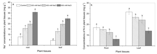 The concentrations of Na+ in roots and leaves of A. marina increased significantly with rising salinity (Figure 1a). N uptake by plants was also influenced by the external salt addition. The presences of salt directly reduced N accumulations in the plant tissues (Figure 1b).