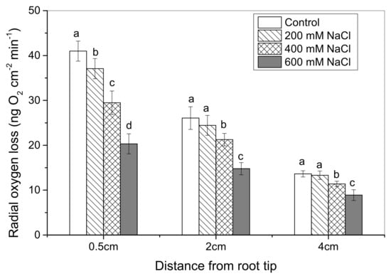 The present study (Table 2 and Figure 2) showed that salt can directly inhibit ROL from roots. ROL in apical roots were more sensitive to the external salinity. The values of ROL at 0.5 cm from root tip were significantly inhibited when treated by salt, even in the lowest salt treatment (200 mM NaCl). Similar reductions in ROL induced by heavy metals were also reported by previous study [].