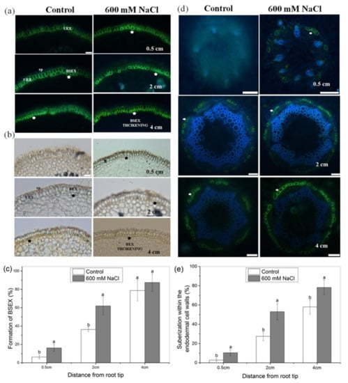 Root suberization in A. marina subjected to salt. Root sections (0.5, 2, and 4 cm from root the tip, bar = 50 µm) made from control and salt treated (600 mM NaCl for 1 week) roots. (a) Suberization within the exodermis, green-yellow fluorescence indicated suberization, and the formation of biseriate and suberized exodermis (BSEX) is highlighted with the arrows. (b) Characteristics of outer cell layers and the formation of the second additional exodermis. (d) Suberization within endodermis is shown in figure, and the arrows indicate the deposition of suberin within endodermal cell walls. The statistical analysis of suberization within the exodermis (c) and the endodermis (e), n = 8, the different letters indicate significant differences between treatments at p < 0.05. The abbreviations in the figures are the following: BEX: biseriate exodermis; BSEX: biseriate and suberized exodermis; UEX: uniseriate exodermis; ep: epidermis.