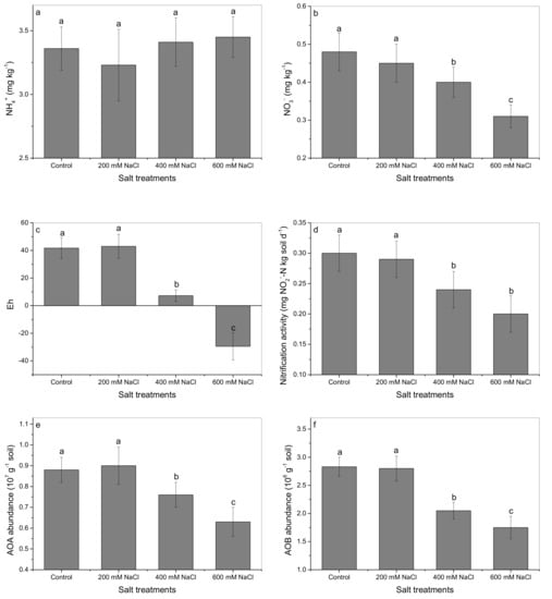The effects of salt on N dynamics in soils were illustrated in Figure 4. Soil NH4+ appears to exhibit no significant differences among the various salt treatments (Figure 4a). The concentrations of NO3−, however, were found to be influenced by salt. When compared to controls, lower concentrations of of NO3− were detected in the soils under salt treatments, especially in the higher salt treatments (400 and 600 mM NaCl) (Figure 4b). Similarly, the significant reductions in soil Eh, nitrification, AOA and AOB gene copies induced by salt (e.g., 400 and 600 mM NaCl) were also observed (Figure 4c–f).