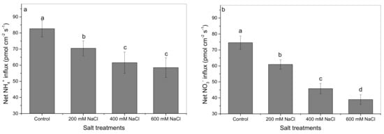 It should be noted that the influences of salt on plant growth did not absolutely coincided with N uptake. In the soil pot trial, growth inhibitions were only observed in the higher salt treatments (400 and 600 mM NaCl); whereas concentrations of total N in the tissues of A. marina sharply declined with elevated salinity. The results from NMT also showed that the presence of salt directly reduced NH4+ and NO3− uptake by A. marina (Figure 5). Patel et al. [] found that the growth of A. marina was significantly promoted by low salinity; however, the concentrations of K, Ca, Mg, and N decreased significantly. All of these data indicated that A. marina may possess some mechanisms that maintain growth and productivity under a moderate salt stress, whereas N acquisition is restrained. It has been [] reported that low salinity can promote the activities of nitrate reductase, acid phosphatase and alkaline phosphatase in Bruguiera parviflora, which may partially alleviate nutrient metabolism under salt stresses. Antioxidant systems [,], salt secretion [,], and nutrient re-sorption [] may also benefit plant growth and alleviate salt induced inhibition.