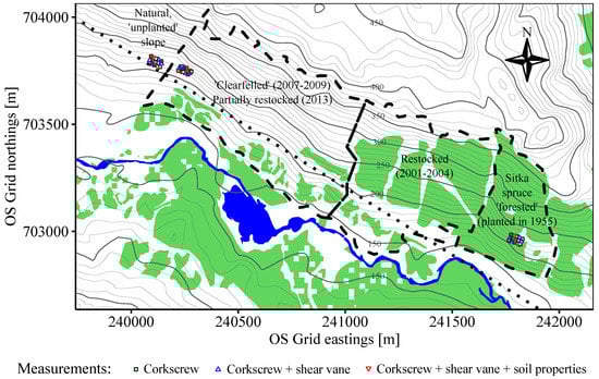 Field experiments were performed at Loch Ard forest at the Queen Elizabeth Forest Park and neighbouring land at Comer Estate near Aberfoyle (UK) in April 2016 over the course of three days. The same 30 (approximately 1:2) south–south west facing slope of Gleann Dubh (561138.3 N 4334.2 W) was used in all testing. Measurements were taken at three different locations on this slope, all in close proximity (<2 km), reflecting different planting treatments: