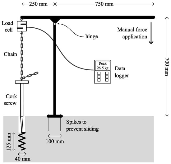 24] only the peak strength was recorded using a 500 kg load cell (DBBE-500kg-003-000, Applied Measurements Ltd., Aldermaston, UK) connected to a hand-held portable strain gauge indicator (TR150, supplied by Applied Measurements Ltd., UK). Corkscrews were installed by hand and extracted using a custom-made fulcrum and lever (