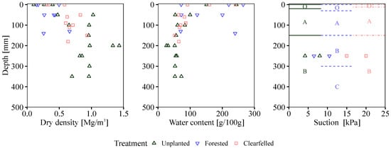 ) where the strength in the ‘forested’ slope is lower than in the ‘unplanted’ and ‘clearfelled’ slopes, and at 250–375 mm depth (