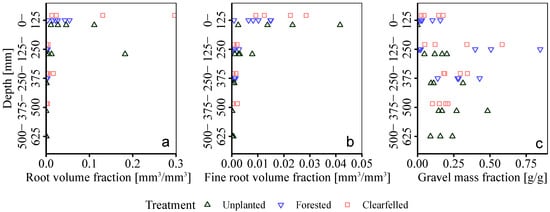 Figure 7a,b). Roots in the different treatments belonged to different species: on the ‘unplanted’ slope most of the roots consisted of (black) bracken roots, on the ‘clearfelled’ slope they were largely grass roots with some (thicker) roots thought to be heather or old Sitka spruce roots and on the ‘forested’ slope roots belonged to the tree species present. Especially on the ‘forested’ (Sitka spruce) and ‘unplanted’ slope (bracken) a large part of the root volume consisted of thick roots (