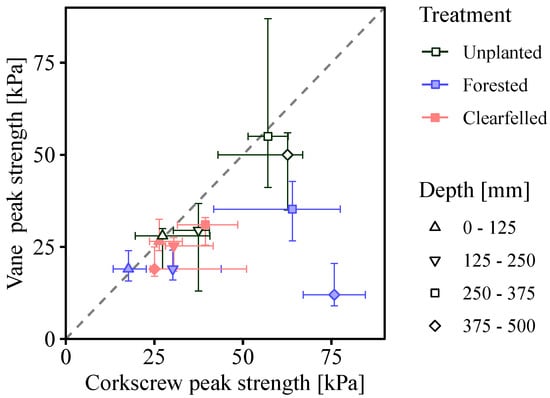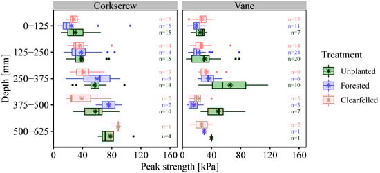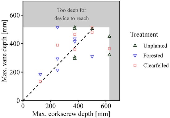 In all treatments, but especially in the ‘forested’ treatment, it proved difficult to obtain corkscrew measurements at depths >375 mm because of the proximity of bedrock and/or presence of large stones. This is reflected in the reduced number of successful corkscrew measurements. Similar refusal issues were encountered when using the shear vane, resulting in a lower number of successful tests at larger depth.