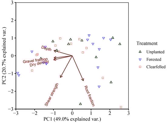 Figure 13). The first principal component (PC1) accounts for the strong correlation between shear strength, depth, dry density and the gravel fraction. This can be understood as the variation in the contribution of soil component towards the combined soil–root shear strength: greater depths and increased densities both increase the effective stress in the soil, while an increased amount of gravel will increase the soil friction angle. Both effects lead to an increase in soil shear strength. The negative contribution of the root fraction to PC1 reflected the decreasing root content with depth. The second, much weaker, principal component (PC2) reveals the positive contribution of roots to the measured soil–root shear strength. In summary, this analysis suggests that the variations in the measured shear strength of the rooted soil were dominated by variations in the strength of the soil rather than variations in root-reinforcement. This helps to explain why differences in measured shear strengths between treatments were largely non-significant.
