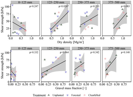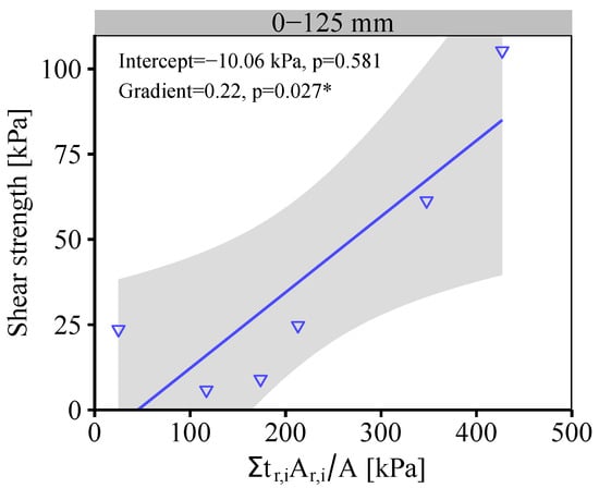 Both the shear strength–dry density/depth/gravel trend (PC1) and the shear strength–root fraction trend (PC2) were explored in more detail. For soil depths with relatively few roots (depth > 125 mm),