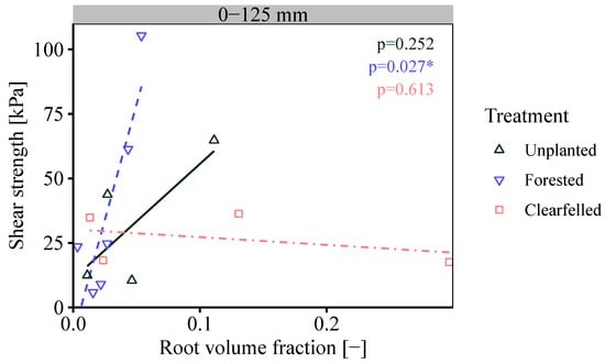In the surface layer (0–125 mm) of the ‘forested’ slope, a significant positive correlation was found between root volume and measured root-reinforced shear strength (as measured with the corkscrew, see