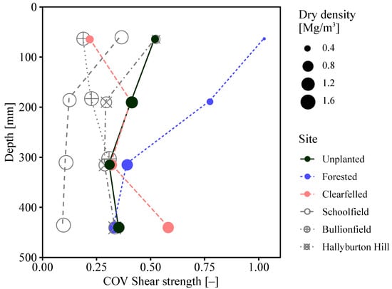 ) where the ‘clearfelled’ slope demonstrated a relatively low strength. For vane testing, the effect of treatment on strength was only significant at 250–375 (