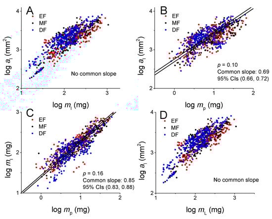 The scaling exponents for AL vs. MP in the EF and MF were, respectively, 0.71 (95% CIs = 0.66, 0.76, n = 335, r2 = 0.56) and 0.72 (95% CIs = 0.66, 0.78, n = 160, r2 = 0.73), each being significantly <1.0 with a common slope of 0.70 (95%CIs=0.67, 0.73) (Table 3; Figure 2B). Further, the scaling exponent in the DF was 0.67 (95% CIs = 0.62, 0.72, n = 330, r2 = 0.54) and also significantly <1.0 (Table 4; Figure 2B).