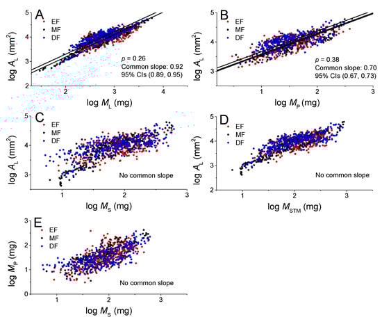For AL vs. MSTM, the EF, MF, and DF had scaling exponents of 0.85 (95% CIs = 0.79, 0.92, n = 335, r2 = 0.48), 0.93 (95% CIs = 0.88, 0.98, n = 160, r2 = 0.86), and 0.75 (95% CIs = 0.71, 0.80, n = 330, r2 = 0.64); both were significantly <1.0 (Table 4), as in the case across the three forest types (Table 4; Figure 2D).