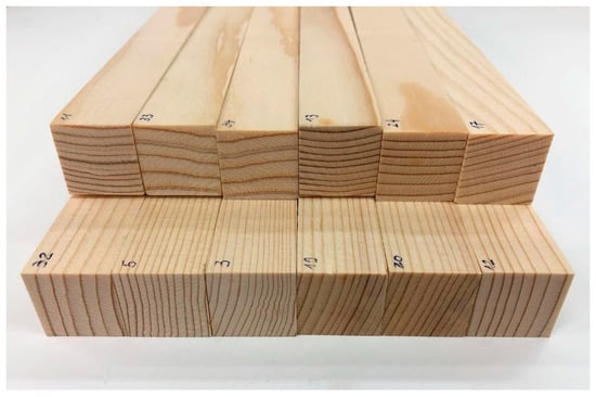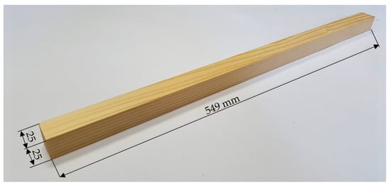 A company specialising in manufacturing windows and doors made of wood kindly provided the samples used for testing purposes. Initial samples were made of Norway spruce (Picea abies) wood and had the dimensions after mechanical processing of 25 mm × 25 mm × 549 mm (b × h × L) (Figure 1). Detailed measurements for each sample were determined right before testing.