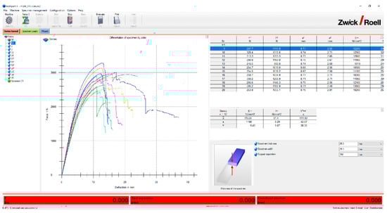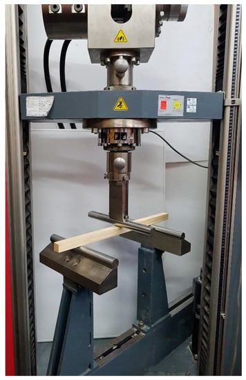 Although the machine has the capability to perform many kinds of tests, we focused on a three-point bending test until rupture for our wood specimens. The cylindrical supports had a diameter of 30 mm and were separated by 350 mm, which corresponded to 14 times the height of the tested samples and was in accordance with International Standard Organisation (ISO) 13061-4: 2014, to determine the modulus of elasticity in a static bending test [25]. The load was exerted by a similar-sized cylindrical block at the midpoint of a sample, with a constant speed of 10 mm/min.