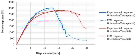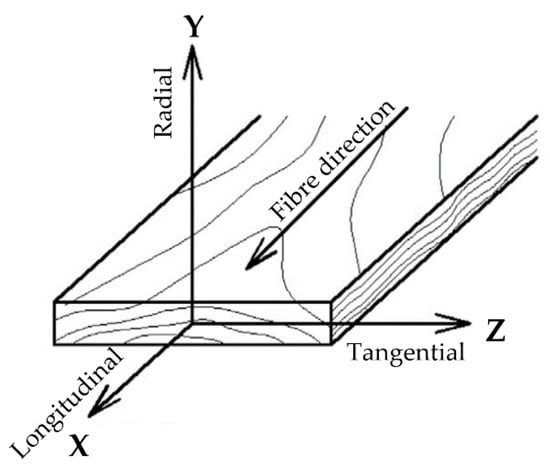 The bending tests were performed for two orientations of the wood: the tangential (Z) and radial (Y) directions. For the tangential orientation, the applied load was perpendicular to the XY-plane, while, for the radial, it was exerted perpendicular to the XZ-plane (Figure 5).