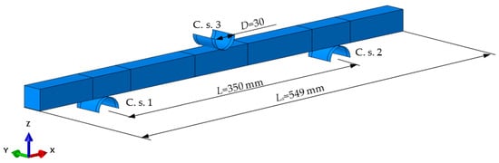 The loading conditions of a three-point bending test are modelled implementing a three-dimensional computational model in the framework of the ABAQUS code [34]. The computational model consists of three-dimensional spruce wood specimens and three cylindrical supports (CS), which are modelled as analytical rigid surfaces (Figure 6) where L is the distance between supports and D is the diameter of the cylindrical supports. In the proposed computational model, the spruce wood specimens have the same dimensions as those used in the experimental tests, i.e., 25 mm × 25 mm in cross-section (b × h) and 549 mm in length (L).
