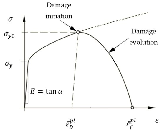 where ωD is a state variable that increases monotonically with the plastic deformation. If the parameter ωD equals zero, it means that the material is undamaged, and in the case where parameter ωD equals one, the material is completely damaged. Figure 6 illustrates the characteristic stress-strain behavior of a material undergoing damage. The solid curve in Figure 7 represents the damaged stress-strain response, while the dashed curve refers to the response in the absence of damage. In Figure 7, the material parameters σy0 and ε ¯ D p l are the ultimate strength and equivalent plastic strain at the onset of damage, while ε ¯ f p l is the equivalent plastic strain at failure [34]. In the proposed material model, the damage evolution is prescribed in the exponential form.