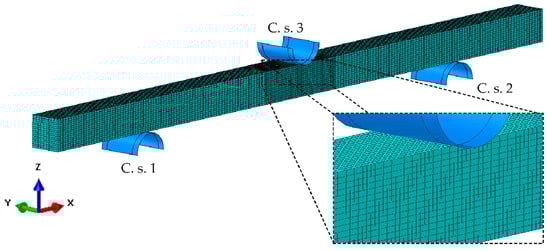 The boundary conditions as presented in Figure 6 were prescribed using the cylindrical supports. The constant displacement was prescribed in the vertical direction at the cylindrical supports 3 (CS-3) to perform the bending loading, while the other two cylindrical supports were constrained in all degrees of freedom (see Figure 6). The contact between wood specimen and supports was defined in both normal and transverse directions with consideration of the static coefficient of friction. In the performed computational analysis, the value of static coefficient of friction μfr,stat equaled 0.4. The geometry of the wood specimen was meshed using linear hexahedral elements of the C3D8R type. Mesh sensitivity was considered carefully with a convergence study, to ensure that the model was capable of calculating associated deformations precisely. The average size of finite element 2 mm has been found to give converged results. The total number of solid finite elements representing the wood specimen was approximately 7600 (Figure 8).