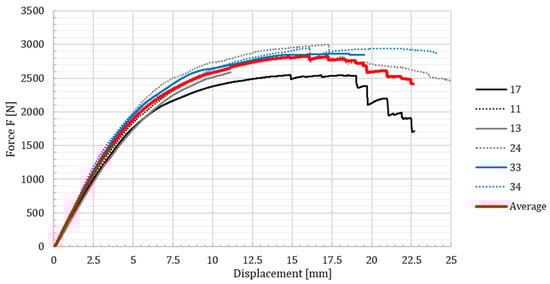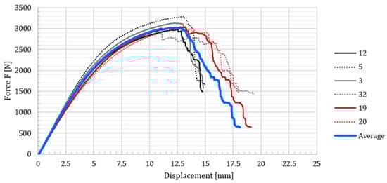 To calculate a mean response force-displacement curve for each specimen’s orientation, data from all six individual experimental tests were used for averaging (see Figure 10 and Figure 11).