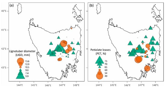Geographic variation in: (a) lignotuber diameter at the cotyledonary node (LIGD); and (b) the percentage of nodes expanded at six months of age which had petiolate leaves (PET), measured on seedlings from 37 Eucalyptus pauciflora provenances distributed within the island of Tasmania (re-analysed data from Gauli et al. (2015). The provenance estimates of marginal means (EMMeans) for LIGD are plotted such that the larger the brown circle the greater the LIGD mean is above the grand mean, and the larger the green triangle the more the mean is below the grand mean. For PET, the plotting is reversed such that the smaller values of the EMMeans for PET (thus plants are more juvenile) are depicted with larger brown circles. Seedlings from provenances in the central region of the distribution tend to have larger lignotubers and to retain juvenility longer (i.e., low proportion of nodes with petiolate leaves).