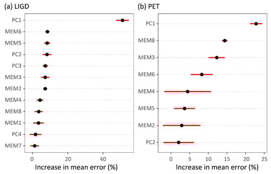 Importance of specific climate variables and Moran’s eigenvector map variables in the final extended forest models fitted for: (a) lignotuber diameter at the cotyledonary node (LIGD); and (b) percentage of nodes expanded at six months of age which had petiolate leaves (PET). The importance of each independent variable was assessed through the percentage increase in mean-squared error (IncMSE) of the extended forests model, following the conditional permutation method of Strobl et al. (2008) (see the Materials and Methods Section and Figure 2 caption for further details). The original climate variables initially fitted in preliminary models are detailed in Table S1. Independent variables causing a decrease in IncMSE were sequentially dropped during model development. The most important independent variables in the models for LIGD and PET were the provenance home-site maximum temperature of the warmest week (TMXWW) and the precipitation of the driest quarter (RDRYQ), respectively. The MEMs are as detailed in the Figure 2 caption.